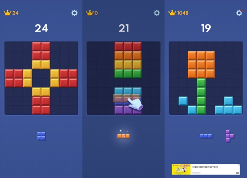 テトリスのようにブロックが自動で落ちてくるのではなく、3つのブロックパーツの中から好きなものを選んで自分のペースで配置できるのがポイント。時間制限もないので、じっくり考えながら遊べます。