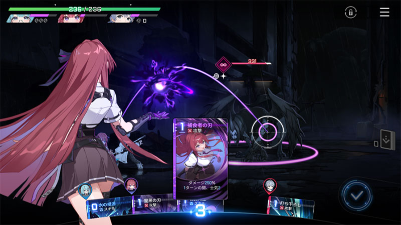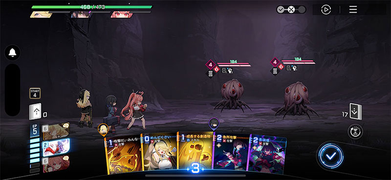 カオスゼロナイトメアの戦闘は、カードデッキ構築とローグライク要素が融合したターン制バトルです。キャラクターごとの固有カードを切りながら組み立てていくタイプで、戦略性の高い戦闘が楽しめます。
