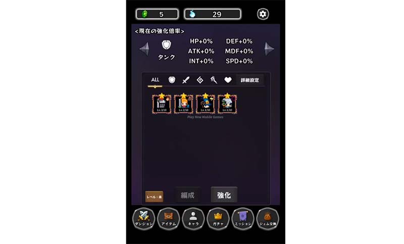 4体のキャラクターを編成してダンジョンに送り出すと、自動で戦闘が進んでいきます。片手操作でOKなので、通勤・通学中やスキマ時間にもサクサク遊べます。