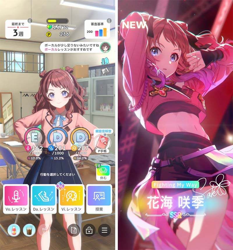 ボーカル、ダンス、ビジュアルの3つの能力を成長させていくことで、試験後のライブステージでのパフォーマンスも変化していきます。