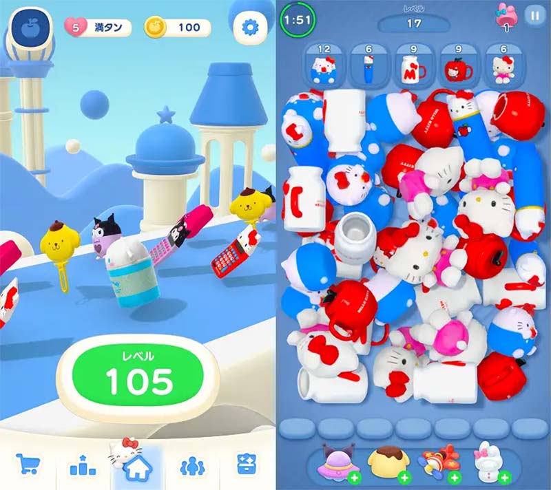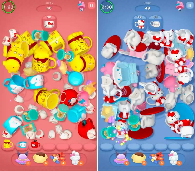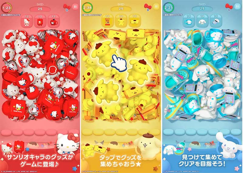 ゲームの遊び方はとてもシンプル。画面にギュギュッと山盛りに積み上げられたサンリオグッズの中から、同じものを3つ見つけてタップするだけ。