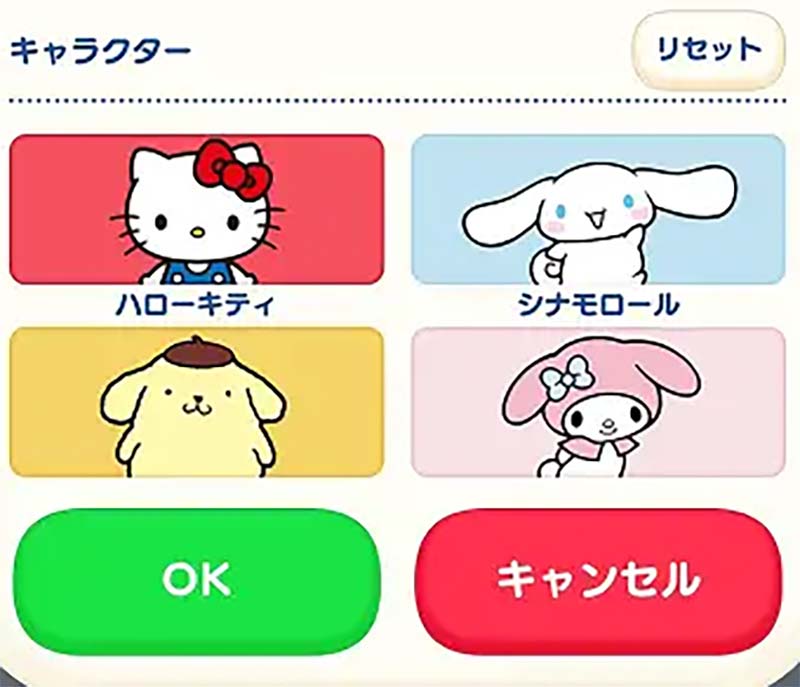 ハローキティ、シナモロール、マイメロディ、クロミ、ポムポムプリン、けろけろけろっぴ、タキシードサム、ポチャッコ、ハンギョドン、リトルツインスターズ、パティ&ジミー、マロンクリーム、バッドばつ丸、みんなのたあ坊、ディアダニエル、ウィッシュミーメル、マイスウィートピアノ、あひるのペックル、ぐでたま 他