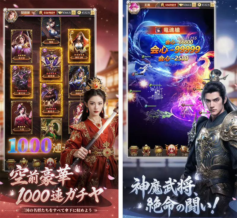 しかも10連ごとに最レア武将が1名確定で手に入るので、序盤から強力なキャラクターを集めてゲームを進められます。
