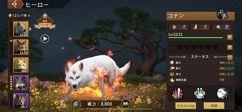 自然に存在するオオカミたちを育成、そして狩猟や採取で資源を集め自分の領地を拡大していきます。